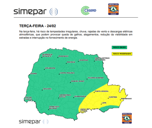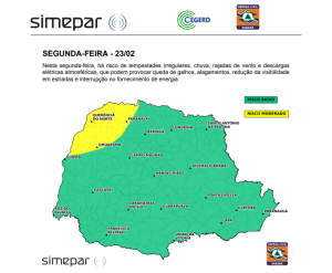 O boletim de gestão de risco emitido pela Defesa Civil e pelo Simepar aponta que o litoral do Paraná permanece em estado de atenção para as chuvas. Conforme os órgãos, a condição de instabilidade permanece nos próximos dias, podendo ocorrer tempestades isoladas. A expectativa é que o volume de chuva no litoral seja mais significativo que em outras regiões do estado, e não se descartam valores superiores aos 100 mm até quarta-feira (25).