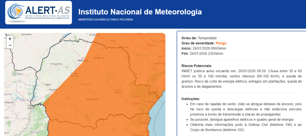 A região leste do Paraná está com alerta vigente para possibilidade de chuvas intensas a partir da tarde desta quinta-feira (29). De acordo com o Simepar, o litoral pode registrar alto volume de chuva, rajadas de vento e grande incidência de raios. O Instituto Nacional de Meteorologia (Inmet) também está com alerta vigente para possibilidade de chuvas intensas e tempestades.