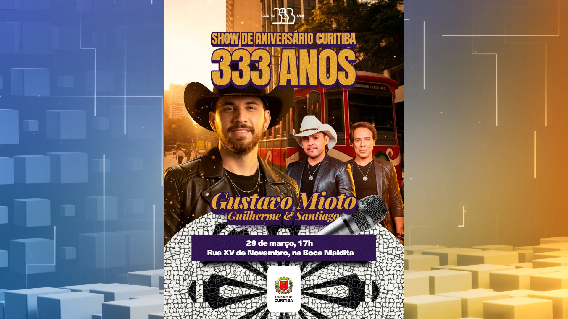 O aniversário de 333 anos de Curitiba vai ser cheio de sertanejo para os curitibanos, no domingo (29). A Prefeitura de Curitiba anunciou o cantor Gustavo Mioto e a dupla Guilherme & Santiago para participar da programação especial do aniversário com shows gratuitos para a população no calçadão da Rua XV de Novembro, no Centro.