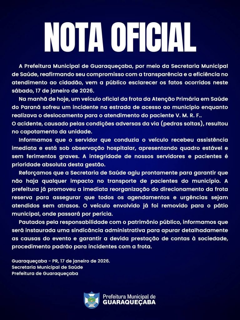 A Prefeitura também anunciou que uma sindicância administrativa será instaurada para apurar as causas do acidente e assegurar a devida prestação de contas à sociedade, seguindo os procedimentos padrão para incidentes envolvendo a frota municipal.