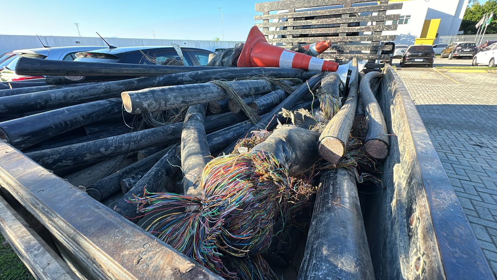 De acordo com informações repassadas à polícia, um funcionário de uma empresa local acionou a equipe que realizava patrulhamento na área após notar uma movimentação suspeita envolvendo a retirada de cabos. No local, os policiais abordaram dois veículos ocupados por sete homens uniformizados.