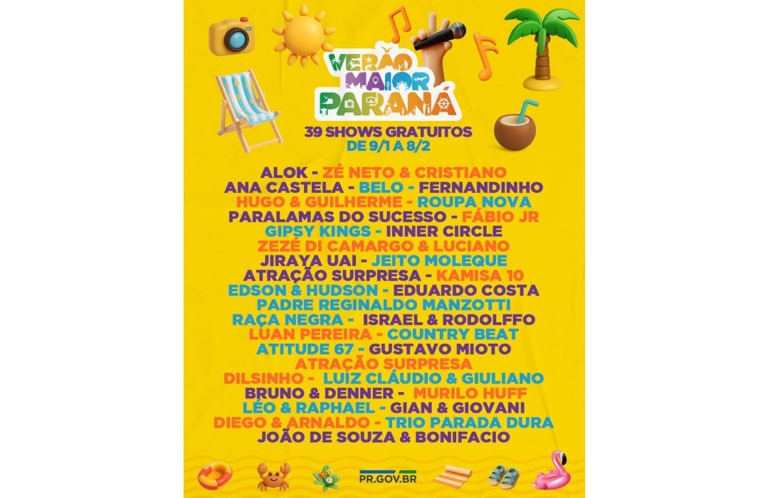 O Governo do Paraná anunciou nesta terça-feira (21) os nomes das atrações do Verão Maior Paraná 2026. São cinco finais de semana seguidos de espetáculos gratuitos, de 9 de janeiro a 8 de fevereiro. Entre as novidades estão shows nas quintas-feiras, atrações internacionais e palcos que devem ser maiores do que no ano passado. Os shows acontecerão nas praias de Matinhos e Pontal do Paraná e terão transmissão da TVCI.