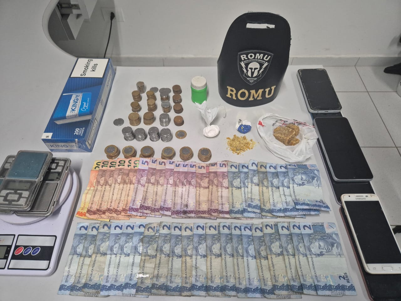 A mulher carregava uma bolsa contendo porções de crack e cocaína, além de R$263,80 em dinheiro trocado. No interior da residência foram encontrados cigarros, balanças de precisão e seis aparelhos celulares.