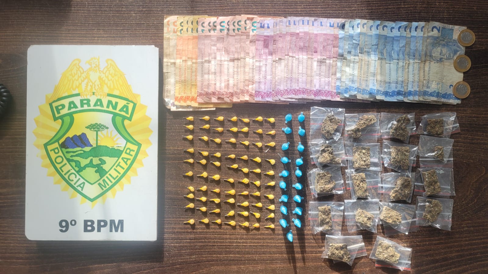 Dentro da bolsa foram encontrados R$ 405 em notas diversas, 19 pinos de cocaína, 70 pedras de crack e 18 invólucros de maconha — todas as porções prontas para comercialização.